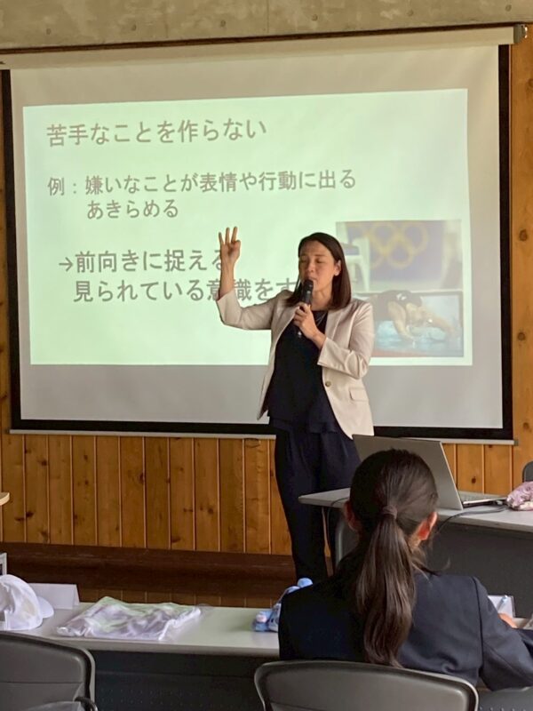 16日は、合宿地である三木市の仲田一彦市長のあいさつで開校。その後、シドニー五輪背泳銅メダリストの佐々木(旧姓・中尾)美樹氏が、「世界を目指して」をテーマに講義を行った。