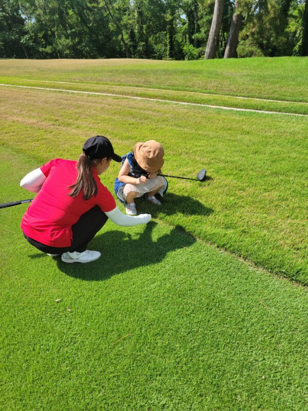 金沢学院のゴルフ部員が見守る中、ゴルフ体験するジュニアゴルファー