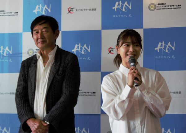 一般社団法人ジュニアゴルフクラブチーム連盟アンバサダーに就任した山内鈴蘭さん(左は俳優の石田純一さん)